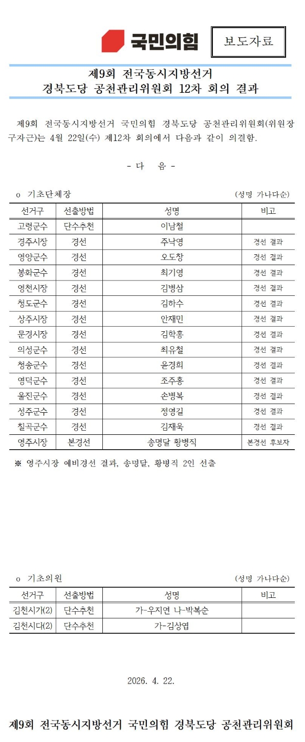 제9회 전국동시지방선거 국민의힘 경북도당 공천관리위원회(위원장 구자근)는 4월 22일(수) 제12차 회의에서 다음과 같이 의결했다고 밝혔다.